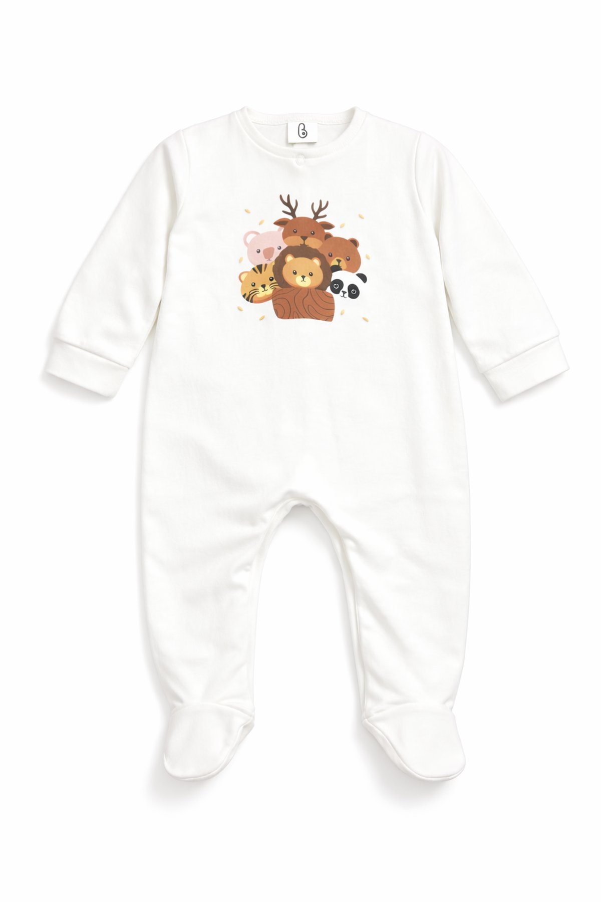 Nuestro osito de algodón en tono tiza presenta una delicada ilustración de animales del bosque, diseñada para aportar calidez sin perder elegancia.
